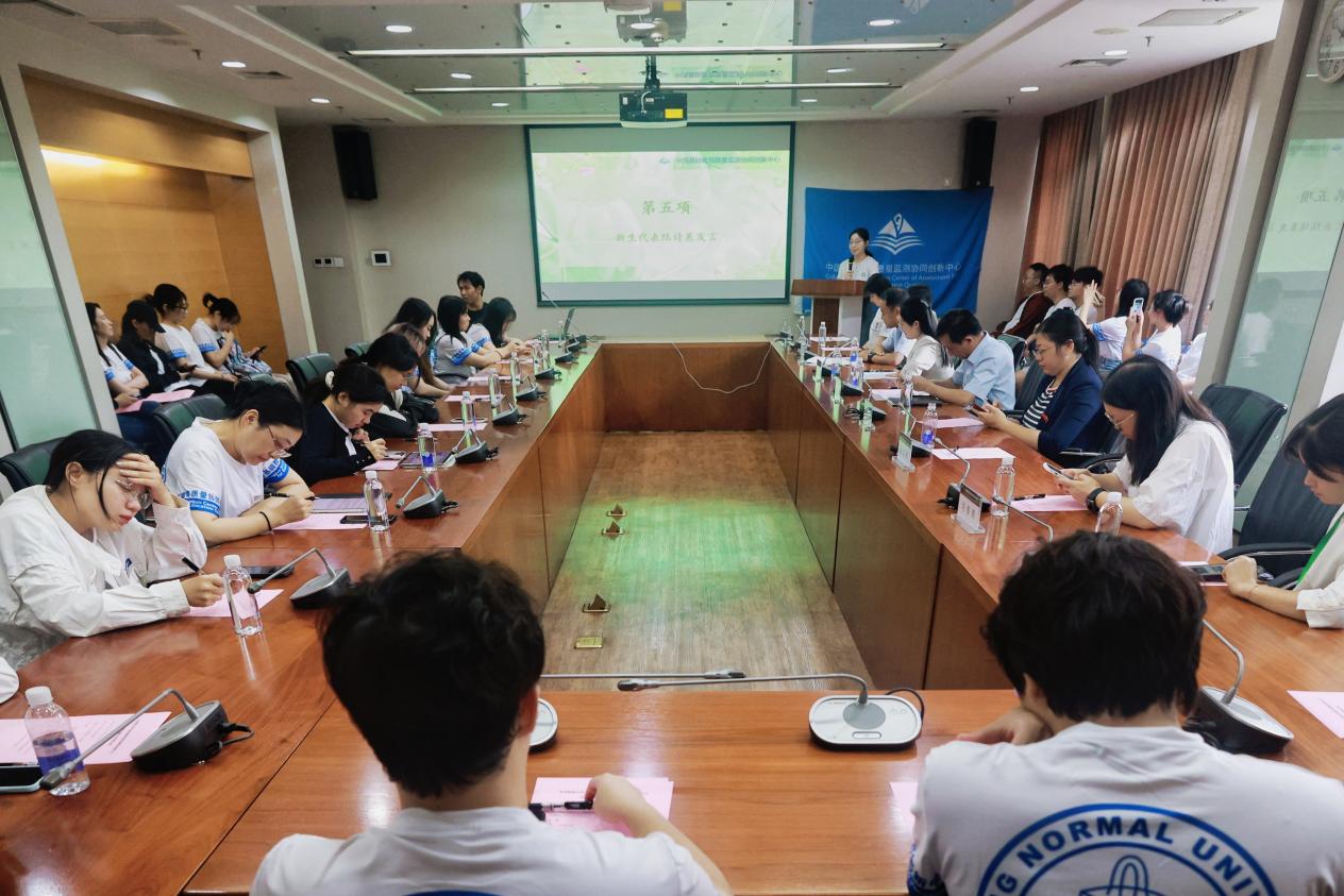 2024级教育学硕士袁乐同学作为在读生代表,结合一年的学习与生活经历,分享了在协同中心的收获与成长。她谈到,学校和中心为学生提供了“看得见、用得上”的平台与视野,从系统的研究方法课程到高水平的学术讲座,从国内外会议的交流机会到实地调研与支教实践,都让她深切体会到中心“少而精”的培养特色与温暖有力的集体氛围。
